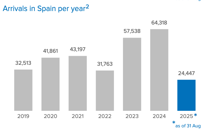 Figure 1: Arrivals in Spain per year. Source: UNHCR SPAIN Weekly snapshot – Week 35 (25 – 31 Aug 2025)