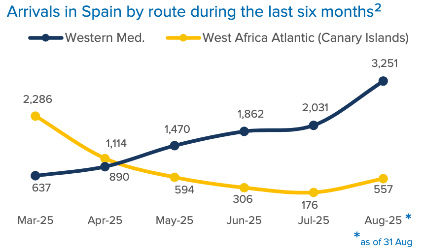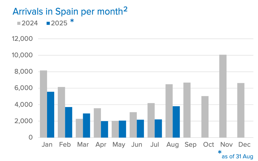 Figure 2: Arrivals to Spain per month. Source: UNHCR SPAIN Weekly snapshot – Week 35 (25 – 31 Aug 2025)