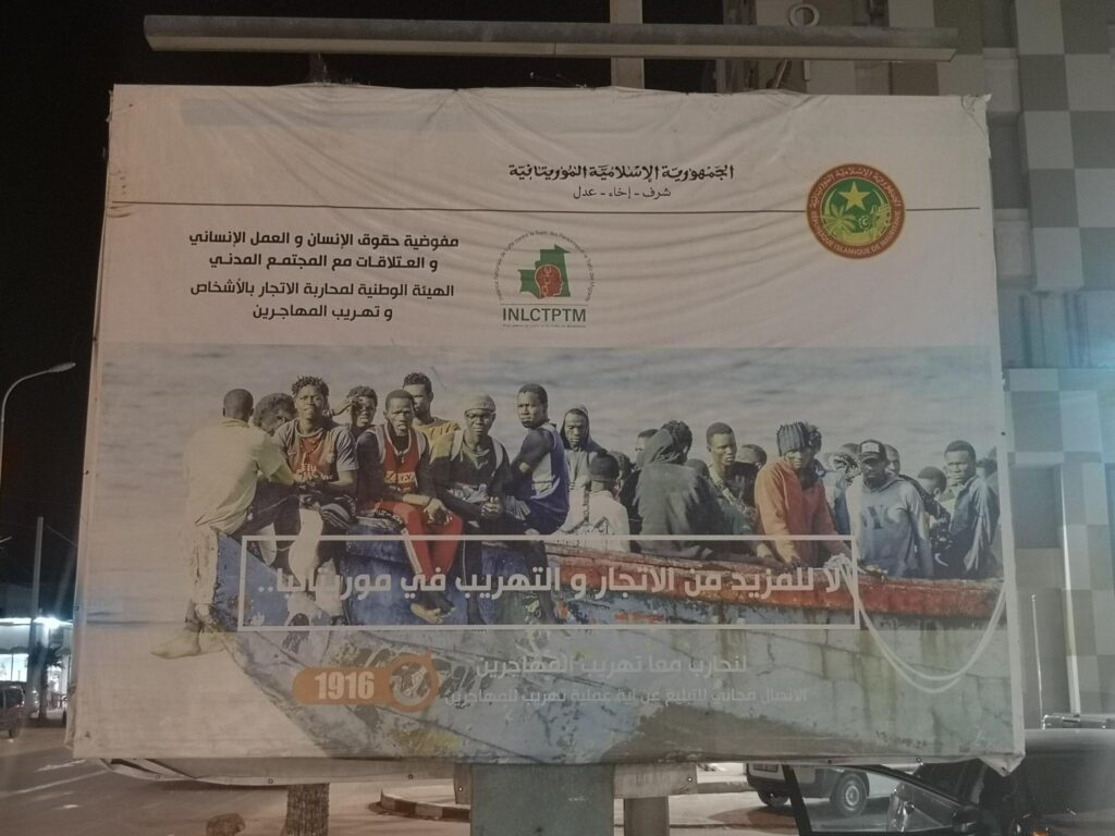 “Islamic Republic of Mauritania: Honour – Fraternity – Justice. Commission on Human Rights, Humanitarian Work and Relations with Civil Society National Authority for Combating Trafficking in Persons and Smuggling of Migrants. ‘No to human trafficking and smuggling of migrants in Mauritania. Together against trafficking.’ Call the toll-free number to report any smuggling operation.” Source: Alarm Phone