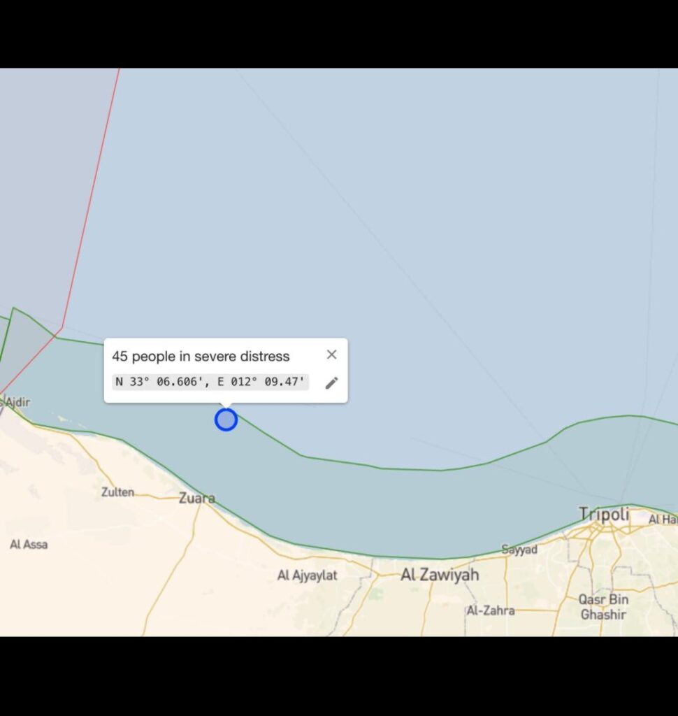 Map showing the position of the boat in distress. Source: Alarm Phone