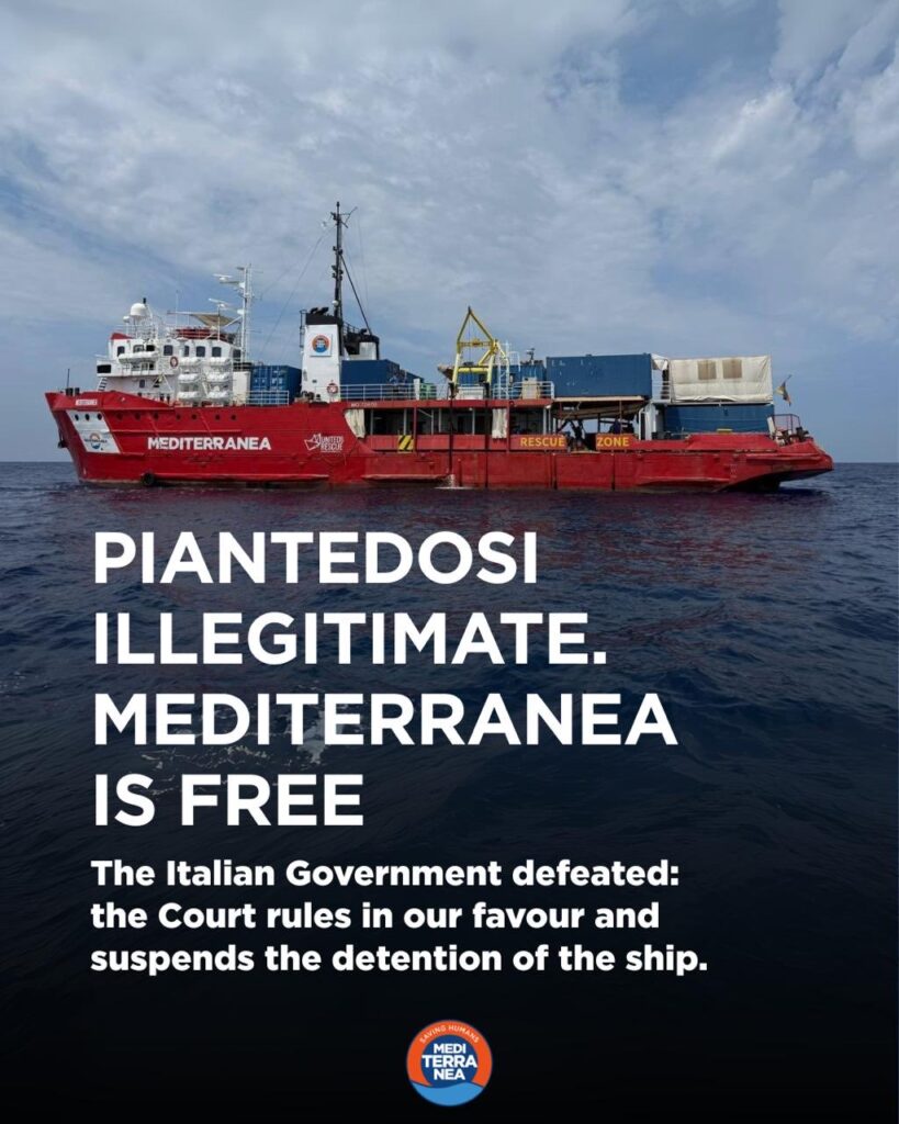 On 11 December, the Agrigento Court issued a decree suspending the administrative detention of the ship Mediterranea, which had been imposed by the prefecture of the Sicilian city on November 12th. It had been an exceptionally severe measure: 60 days of administrative detention of the vessel and a financial penalty of €10,000 for both the captain and the shipowner.