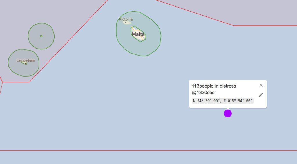 On the same day, Alarm Phone was in contact with about 42 people in the SAR zone of Malta. They reported having been at sea for three days and running low on fuel, food and water. A merchant vessel who offered to intervene told us that they were told by the Maltese authorities that the “case ceased” and received instructions to NOT provide assistance but continue on their way. We could not reach the people any more, MRCC Rome refused responsibility and Malta did not act either. On the next day, we were informed that the group was intercepted inside the Maltese SAR zone and forced back to Libya.