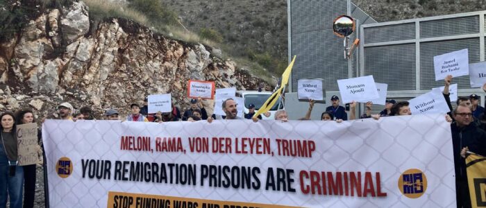 On 1 and 2 November, protests took place in Albania to oppose the Rama-Meloni agreement and to demand the dismantlement of the detention centres built in Gjader and Shegnjin. After a march through the streets of Tirana, activists from all over the world gathered outside the gates of Gjader, in solidarity with the 24 people currently imprisoned. In one year, 220 people were detained in this facility, where Hamid Badoui died on 19 May 2025.