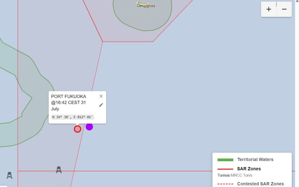 Map showing the position of the boat and the merchant vessel PORT FUKOKA. Source: Alarm Phone