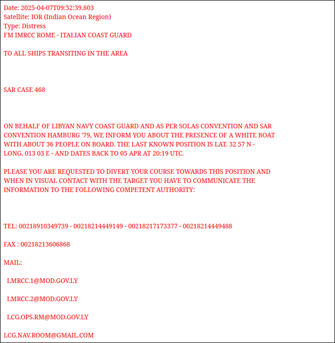 Considering the Mayday Relay by the MRCC Rome was issued 38 hours after the referred position of the boat and repeated five times until the early morning of April 8, it seems that MRCC Rome also had no knowledge of what happened to the boat.
