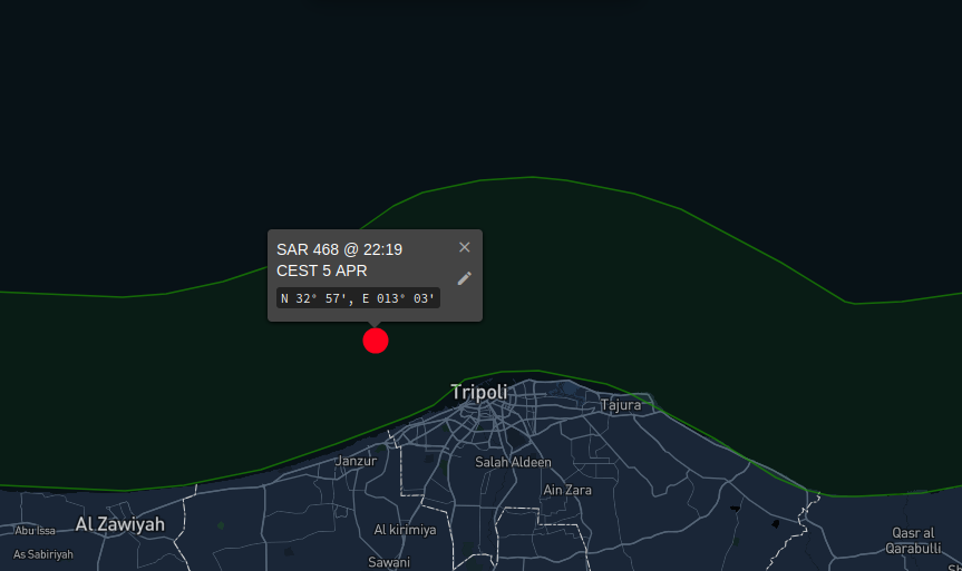 A plane operated by FRONTEX, the European border guard, Eagle 3 (HEX: 43EE55) was flying in the area north of Misrata both on April 27 and 28. On the 27th it even did two flights, one in the morning, one in the afternoon.