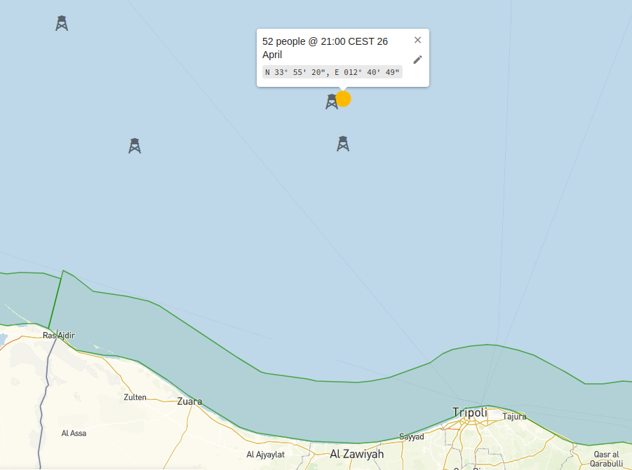 At the end of April, two more boats disappeared and with them around 100 people. In the morning of April 28 Alarm Phone was informed about a boat which departed from Zawiya in the evening of April 26 with 52 people, trying to reach European shores. We received an old position, indicating that a few hours after departure the boat was close to al-Bouri platform , 67 nautical miles north of Zawiyah.