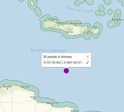 Summary: We spoke with the captain on board, they have visual of the boat in distress and are approaching now. They have them on their starboard side. We informed of the fear the people have and that they should not be returned to Egypt. The captain told us they are coordinating with Hellenic Coastguard and expected them to come for the people.